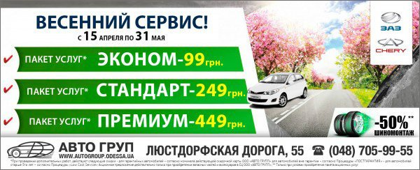 Каждый владелец автомобиля ZAZ, CHERY , в период с 15 апреля по 31 мая 2015 года получает возможность воспользоваться сервисными услугами по акционным ценам* по одному из трех пакетов и провести шиномонтаж со скидкой 50%**!
