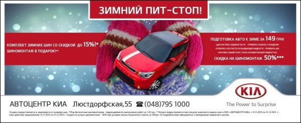 В период с 15 ноября по 31 декабря 2015 года всем клиентам, владельцам автомобилей KIA, сервисный центр ООО «АВТОЦЕНТР КИА» предоставляет возможность приобрести комплект зимних шин со скидкой до 15%* и дополнительно – шиномонтаж в ПОДАРОК**