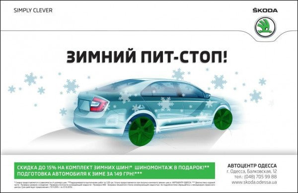 В период с 15 ноября по 31 декабря 2015 года всем клиентам, владельцам автомобилей Skoda, сервисный центр «АВТОЦЕНТР ОДЕССА» предоставляет возможность приобрести комплект зимних шин со скидкой до 15%* и дополнительно – получить шиномонтаж в ПОДАРОК **