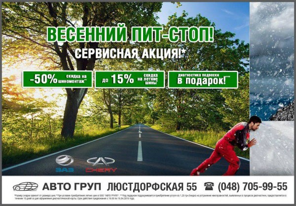 В рамках акции «ВЕСЕННИЙ ПИТ-СТОП», в период с 16 марта по 15 апреля 2015 года, каждый клиент, владелец автомобиля ZAZ, CHERY получает право на проведение диагностики подвески автомобиля в подарок*** и шиномонтаж со скидкой 50%**, при условии приобретения комплекта летних шин со скидкой до 15 %.*