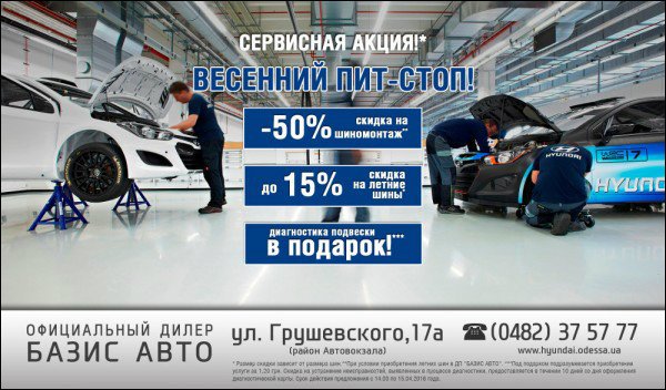 В рамках программы, в период с 14 марта по 15 апреля 2016 года, каждый клиент, владелец автомобиля HYUNDAI, получает право на проведение диагностики подвески автомобиля в подарок** и шиномонтаж со скидкой 50%, при условии приобретения комплекта летних шин со скидкой до 15 %.*