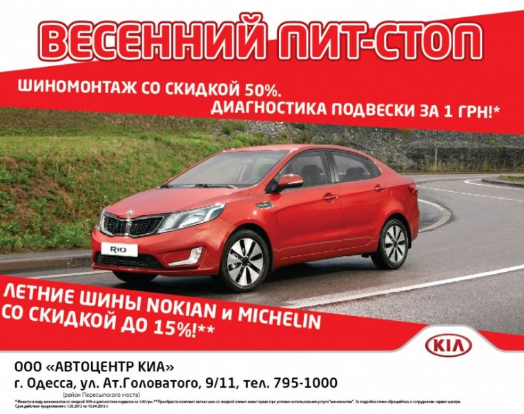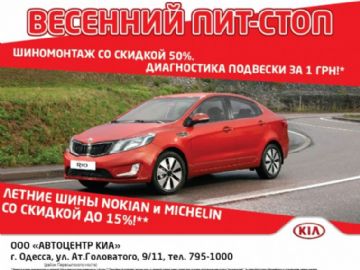 Каждому клиенту, владельцу автомобиля KIA, в период с 1 марта по 15 апреля 2013 года предоставляется возможность провести шиномонтаж со скидкой 50% и диагностику подвески автомобиля – за 1,00 грн.*!.