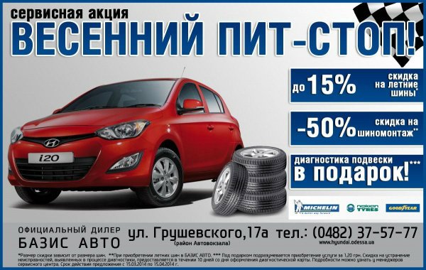 В период с 15 марта по 15 апреля 2014 года, каждый клиент, владелец автомобиля HYUNDAI, получает право на проведение диагностики подвески автомобиля в подарок*** и шиномонтаж со скидкой 50%**, при условии приобретения комплекта летних шин со скидкой до 15 %.*