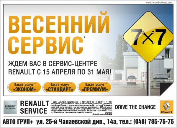 Специально для Вашего удобства, сервисный центр RENAULT объявляет о запуске ежегодной сервисной акции "ВЕСЕННИЙ СЕРВИС 7х7". Каждый владелец автомобиля RENAULT, в период с 15 апреля по 31 мая 2014 года получает возможность воспользоваться сервисными услугами по акционным ценам* по одному из трех пакетов.