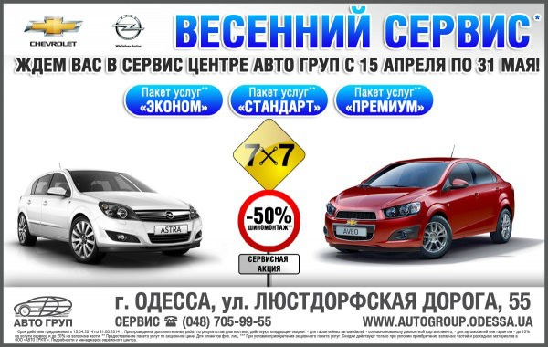 Специально для Вашего удобства, сервисный центр АВТО ГРУП объявляет о запуске сервисной акции "ВЕСЕННИЙ СЕРВИС 7х7". Каждый владелец автомобиля OPEL,CHEVROLET, в период с 15 апреля по 31 мая 2014 года получает возможность воспользоваться сервисными услугами по акционным ценам* по одному из трех пакетов, а также проведение шиномонтажных работ (перебортировки и балансировки колес) со скидкой 50%**.