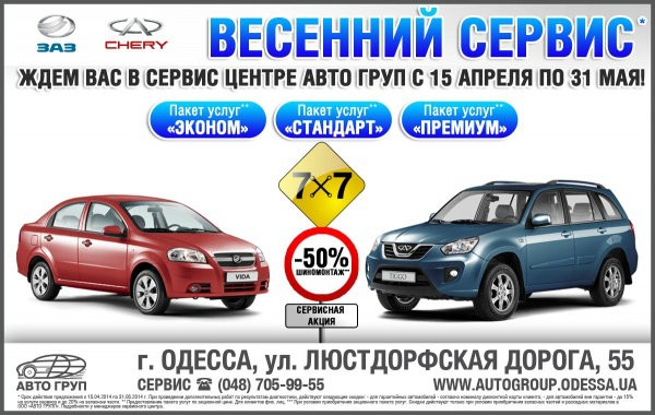 Специально для Вашего удобства, сервисный центр АВТО ГРУП объявляет о запуске сервисной акции "ВЕСЕННИЙ СЕРВИС 7х7". Каждый владелец автомобиля ZAZ,CHERY, в период с 15 апреля по 31 мая 2014 года получает возможность воспользоваться сервисными услугами по акционным ценам* по одному из трех пакетов,а также проведение шиномонтажных работ (перебортировки и балансировки колес) со скидкой 50%**.