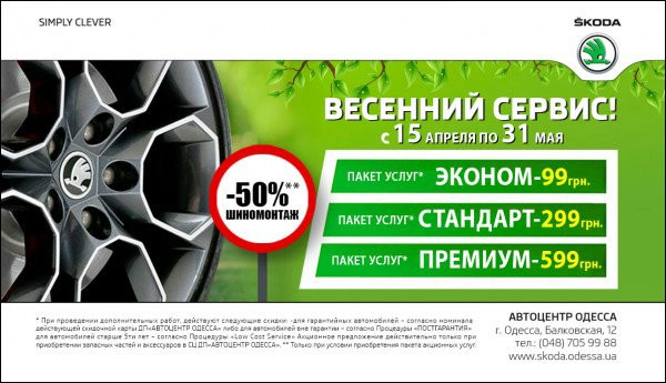 Каждый владелец автомобиля SKODA, в период с 15 апреля по 31 мая 2015 года получает возможность воспользоваться сервисными услугами по акционным ценам* по одному из трех пакетов и провести шиномонтаж со скидкой 50%**!