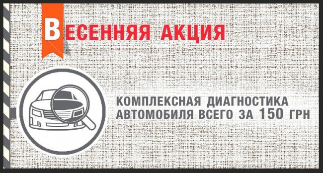 Только у нас в период с 24 марта по 31 мая 2014 года, Вас ждет интересное предложение, которое позволит быстро и выгодно подготовить ваш автомобиль к весеннему периоду! Мы предлагаем Вам пройти комплексную диагностику вашего автомобиля, по специальной стоимости - 150 грн., в которую входит:.