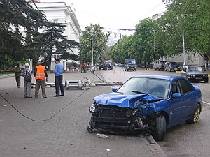 Во время дождя иномарка из-за ошибки водителя на высокой скорости выехала та тротуар и врезалась в фонарный столб, опрокинув его на землю.