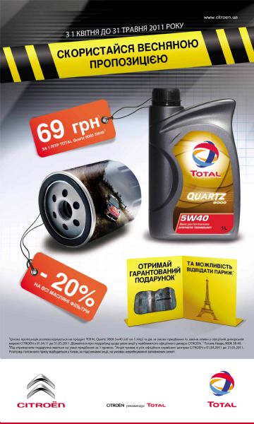 Скоро лето, пора длинных поездок к морю, родственникам, на отдых. И чтобы двигатель автомобиля работал как часы, ему нужен тщательный уход со своевременной заменой масла. В преддверии летнего сезона, с 1 апреля по 31 мая, представительство «Ситроен Украина» предлагает владельцам автомобилей Citroёn замену масла на специальных условиях. Причем каждый клиент, заменивший масло, получит подарок и может выиграть поездку во Францию.
