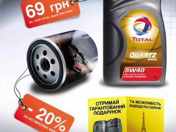 При этом приятные моменты ожидают поклонников этой изысканной марки уже на этапе замены масла. Во-первых, они получают скидку 20% на масляный фильтр, специальную цену на высококачественное масло Total и гарантированный подарок. А во-вторых - купон, который дает право на участие в розыгрыше путевки на родину любимого автомобиля. Акционная цена 1 литра масла Total Quartz 9000 5W40 на период с 1 апреля по 31 мая - 69 грн.