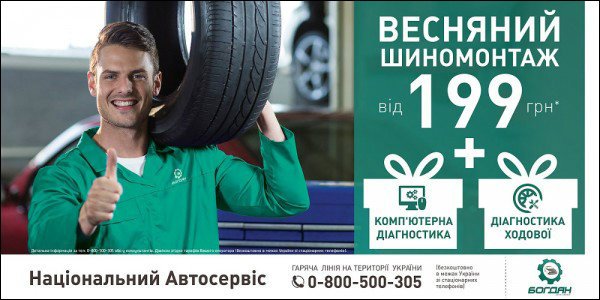 * Акционное предложение «Сезонный шиномонтаж + 2 диагностики в подарок» действует на всех СТО сети «Богдан-Авто Холдинг» (кроме «Богдан-Авто Кривой Рог», «Богдан-Авто Киев») с 6.03.2017 г. по 30.04.2017 г. Стоимость пакета услуг не включает стоимость расходных материалов (грузики). Действие карт лояльности «Аккумулятор» и другие скидки на указанные акционные предложения не распространяются.