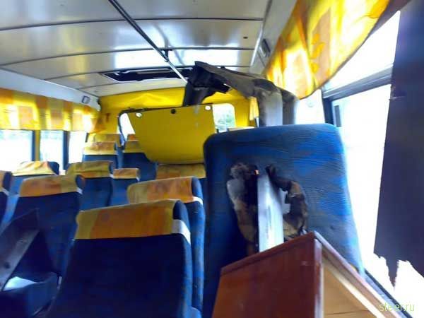 Эта железная полоса проткнула автобус, и через двигатель вошла в салон, проткнула одно пассажирское сиденье на уровне головы и вышла в заднее стекло.