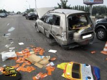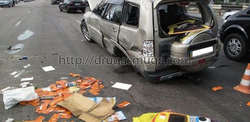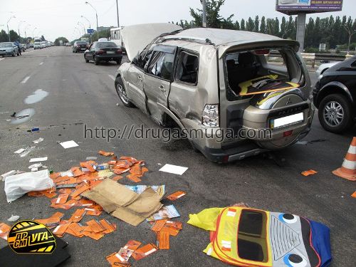 Серьезное ДТП с участием известного украинского спортсмена Василия Вирастюка произошло сегодня 01.08.10 около 14.30 на Одесской площади на путепроводе. По предварительным данным Василий Вирастюк на автомобиле Mitsubishi Pajero Wagon двигался от Большой Окружной в направлении Столичного шоссе в левой полосе. Ему навстречу - в сторону Жулянского путепровода двигался автомобиль Suzuki Grand Vitara под управлением женщины. Как утверждает женщина, ее Suzuki Grand Vitara подрезал автомобиль ВАЗ и она, чтобы избежать столкновения выкрутила руль влево - на встречную полосу, где в это время двигался автомобиль сильнейшего человека планеты. Избежать столкновения у Василия Вирастюка не было никаких шансов: Suzuki врезался во внедорожник Mitsubishi задним колесом в его заднее колесо. Удар был настолько сильным, что колеса вырвало у обоих внедорожников. Кроме того, у Mitsubishi Pajero колесо диском уперлось в асфальт и сработало как трамплин/пружина, после чего автомобиль несколько раз перевернулся. В это время, предположительно, из люка вылетела супруга Василия и оказалась на асфальте.