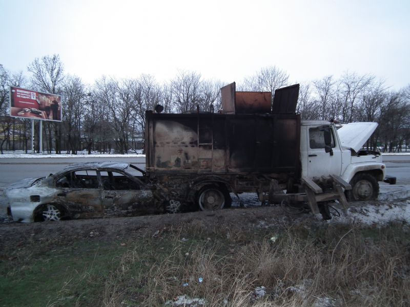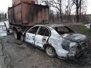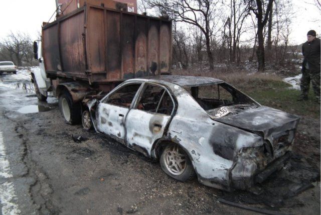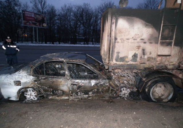 Сегодня ранним утром на выезде из Симферополя легковушка врезалась в мусоровоз, после чего обе машины загорелись. Пострадал водитель легкового авто. Его госпитализировали с ожогами. Определить марку машины удалось только по подушке безопасности, которая, оказалась за пределами автомобиля.