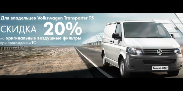 * Скидка в размере 20% на оригинальные воздушные фильтры предоставляется для владельцев автомобилей VolkswagenTransporterT5 при прохождении ТО, согласно Приказа № 25 от 02.06.2014 г. «О предоставлении скидки в размере 20% на оригинальные воздушные фильтры для владельцев автомобилей VolkswagenTransporterT5».