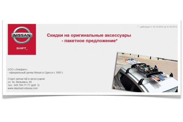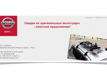Друзья, с 15 октября наш дилерский центр Nissan - ООО "Элефант" - проводит сезонную кампанию по продаже аксессуаров. Скидок на приобретение оригинальных аксессуаров на свои любимые Nissan много, поэтому не пропустите возможность сэкономить до 20%.