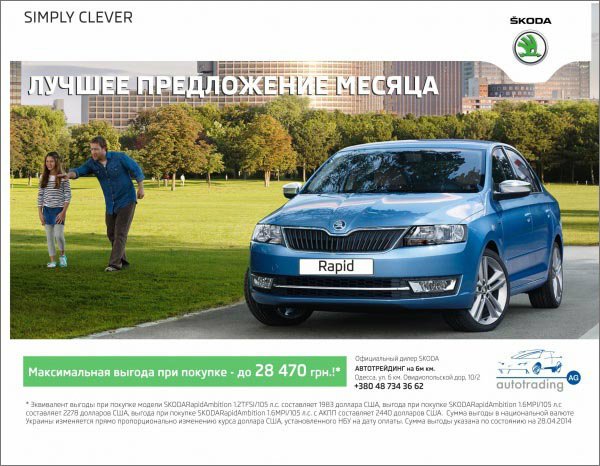 Популярный лифтбэк SKODA - Rapid, уже успевший завоевать симпатии украинских автолюбителей можно приобрести по самой выгодной цене! Максимальная выгода при покупке составляет до 28 470 грн.!* Уникальное предложение действует только до 31 мая 2014 г.