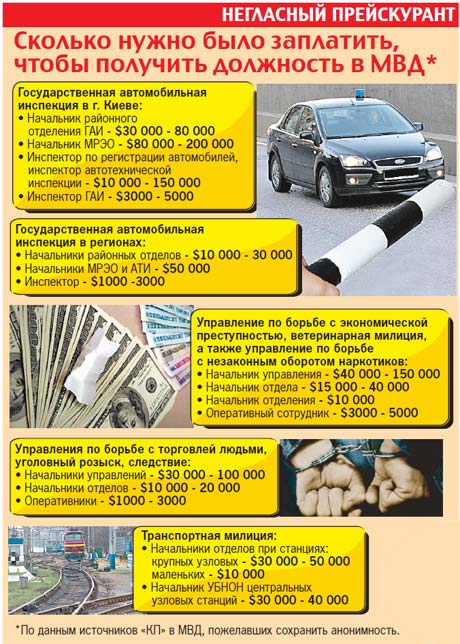 - В столице действовали самые высокие расценки на вакансии, - утверждает наш собеседник. - Чтобы стать начальником райотдела, надо было иметь минимум $30 тысяч, а для должности начальника МРЭО, автотехнической инспекции (АТИ) - от $80 тысяч до 200 тысяч. Инспектором в МРЭО устроиться вообще сложно. Там давно сидят люди, сдвинуть которых с места не так-то просто - дело свое они знают, ежемесячные сборы поступали начальству без перерыва. Коллеги рассказывали, как одному столичному бизнесмену предложили устроить сына после окончания академии МВД в одно из киевских МРЭО. Но за это он должен был приобрести и оформить на имя начальника отдела автомобиль за $15 тысяч.