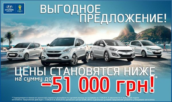 Выгодные ценовые предложения действуют на весь модельный ряд HYUNDAI по 30 апреля 2014 года. Кроме того, еще один аргумент при покупке автомобиля бренда HYUNDAI служит акционное кредитное предложение: широкая линейка первоначальных взносов и возможность беспроцентной рассрочки.