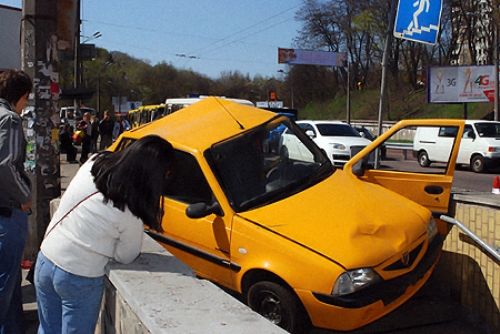 Легковушка Dacia ехала со стороны метро Дорогожичи на Петровку. Вдруг, возле Кирилловской церкви машину начало носить по дороге. Как не пытался водитель удержать легковушку на шоссе ничего не вышло. Иномарка вылетела на тротуар, сбила мусорный бак и залетела в пешеходный переход.
