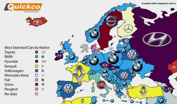 В Quickco отметили, что лишь в четырех странах по количеству поисковых запросов самыми популярными стали местные автопроизводители: в Германии (BMW), Франции (Renault), Швеции (Volvo) и Италии (Fiat). Американцы чаще всего искали информацию о «Тойотах», а японцы и жители Южной Кореи — о BMW.