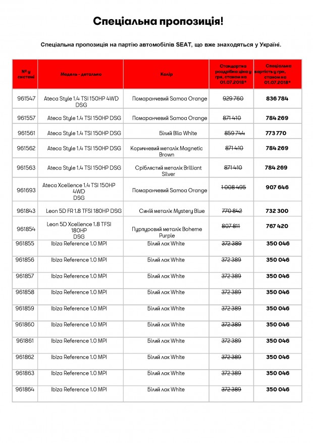 Спеціальні ціни на партію автомобілів SEAT, що вже знаходяться в Україні.