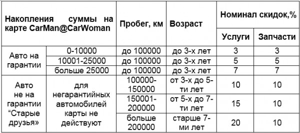 Каждый клиент который обратится на сервисное обслуживание RENAULT, имеет возможность осуществить обслуживание своего автомобиля и получить скидку на работы и запасные части в соответствии с суммой накопления по карте CarMan @ CarWoman и соответствующего номинала скидок или в зависимости от пробега или года выпуска авто.