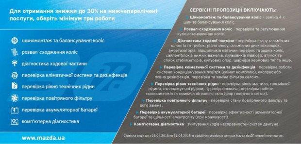 Акція діє з 16.04.2018 по 31.05.2018 в офіційному сервісному центрі Mazda АЛЬФА-М ПЛЮС на пр.. Гагаріна, 314-б.