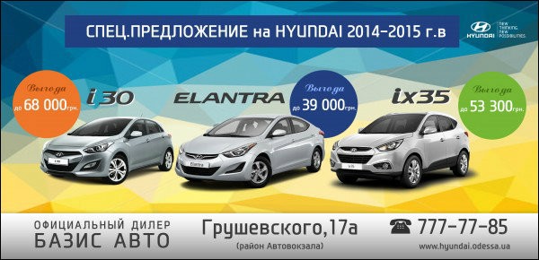 Официальный дилер HYUNDAI в Одессе "БАЗИС АВТО" сообщает о продлении специального предложения на HYUNDAI 2014-2015 года выпуска и предлагает уникальные условия приобретения.