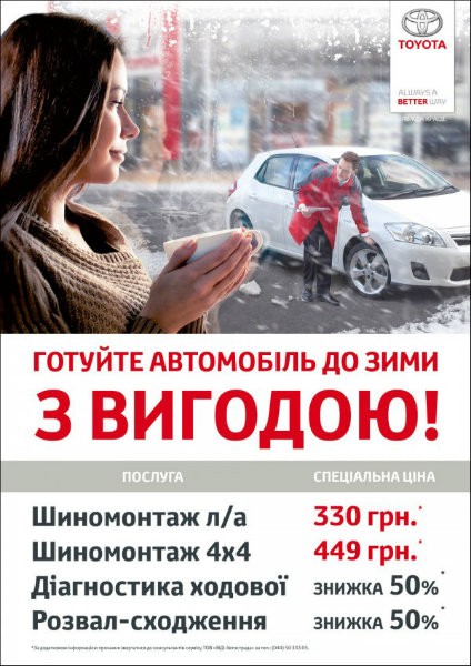 С 15 октября по 31 декабря 2015 года все Клиенты Тойота Центр Киев ВиДи Автострада смогут воспользоваться актуальными сервисными услугами по выгодным ценам, каждая из которых призвана помочь подготовить Вашу Toyota к непредсказуемым погодным «сюрпризам».