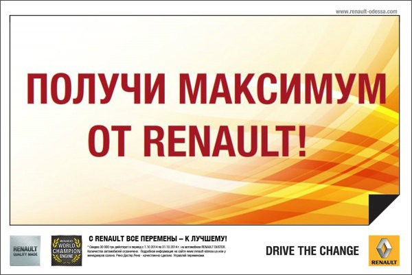 Создавая максимально привлекательные условия для приобретения автомобилей европейской марки и заботясь о своих клиентах, компания Renault предлагает покупателям воспользоваться кредитным предложением по программе Renault Finance. В октябре будет действовать беспроцентный кредит на весь модельный ряд: 0% на 1 год*. Ставка по кредиту остается фиксированной в гривне на весь срок кредитования.
