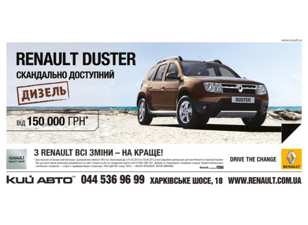*Специальное предложение действует с 06.08.2013 на автомобиль Renault Duster Base 4x2 2013 года выпуска (Кузов: VF1HSRAW549301361). Розничная цена автомобиля: 156 380 грн. Розничная цена комплекта аксессуаров: 3 870,50 грн.