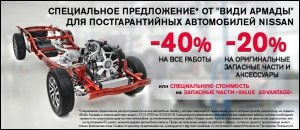 Согласно условиям предложения, в дилерском центре Nissan «ВиДи Армада» Ваш автомобиль ждет скидка в 40% на все работы, 20% на оригинальные запчасти и аксессуары и специальные цены на запасные части «Value Advantage». Скидка предоставляется только по результатам диагностики проведенной в ДЦ «ВиДи Армада».