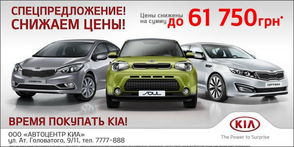 Также снижена стоимость на автомобили бизнес-класса: индивидуальность пространства Kia Optima только сейчас с экономией до 55 900 грн. Элегантный Kia Sorento, сочетающий гармоничные пропорции, солидный классический дизайн, простор и вместительность по цене 462 150 грн.