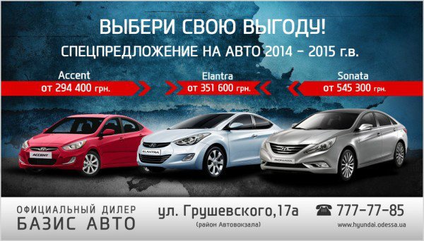 Официальный дилер HYUNDAI в Одессе "БАЗИС АВТО" сообщает о специальном предложении на HYUNDAI 2014-2015 года выпуска и предлагает уникальные условия приобретения.