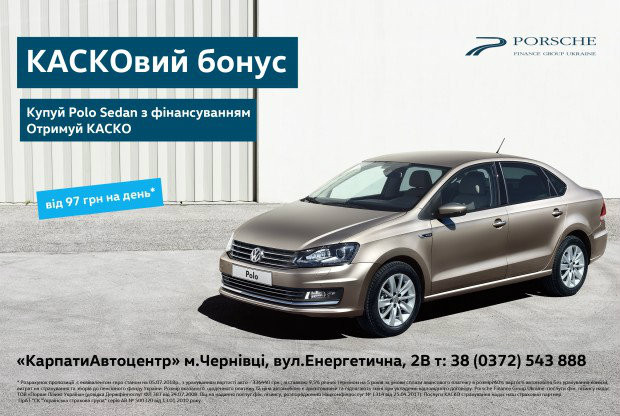 Обираючи VW Polo Sedan з фінансуванням (кредит, лізинг) від автосалону «КарпатиАвтоцентр» Ви гарантовано отримаєте страховий поліс КАСКО в ПОДАРУНОК!