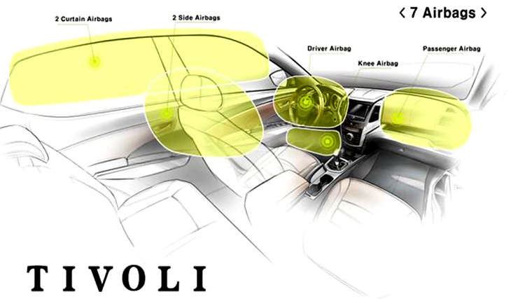 На фото можно увидеть многофункциональный руль и небольшой цифровой дисплей между циферблатами на приборной панели. SsangYong Tivoli Салон модели оснащен семью подушками безопасности, большим сенсорным дисплеем мультимедийной системы, камерой заднего вида, двухзонным климат-контролем и поддержкой подключения мобильных устройств через Bluetooth. SsangYong Tivoli Под капотом SsangYong Tivoli разместятся 1,6-литровые четырехцилиндровые моторы на бензине и дизельном топливе, соответствующие экологическим требованиям стандарта Euro 6.