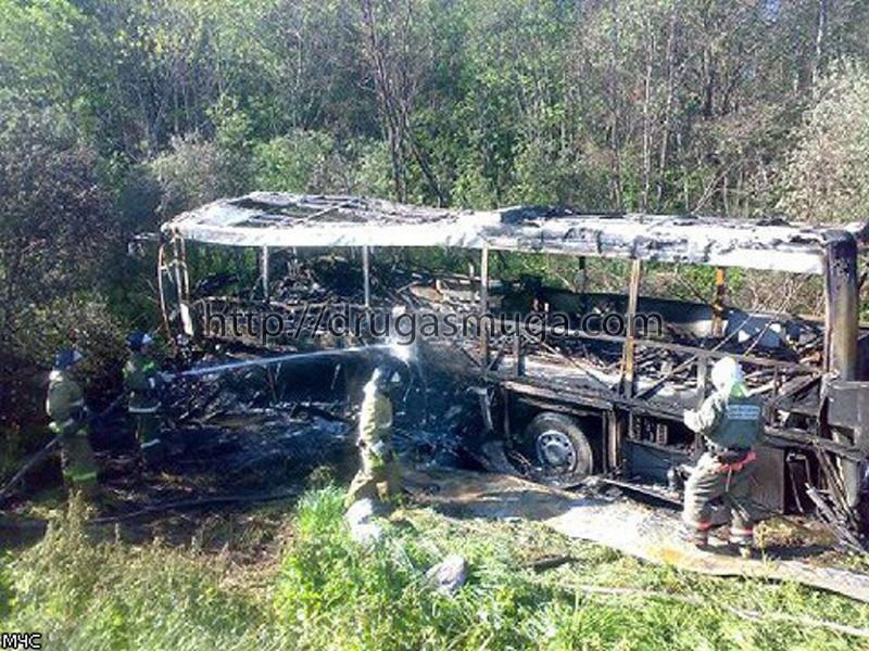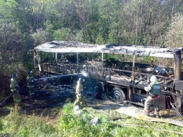 В результате столкновения произошло опрокидывание автобуса и возгорание транспортного средства.