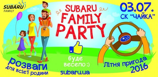 Компания «Субару Украина», официальный дистрибьютор автомобилей Subaru, приглашает всех почитателей марки и ее фанатов на спорткомплекс «Чайка» под Киевом: 3 июля 2016 года здесь в четвертый раз пройдет ежегодный семейный фестиваль Subaru Family Party.