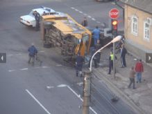Водитель Geely вез своего отца в областную больницу. Так как еще не было 7 утра, светофоры работали в мигающем режиме. Водитель Geely, ехавшей по ул. Черновола, не пропустил маршрутку, врезался в нее. В результате маршрутка упала на бок, а Geely по инерции врезалась в частный дом на ул. Черновола.