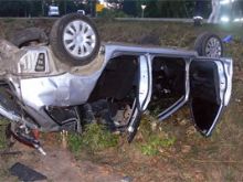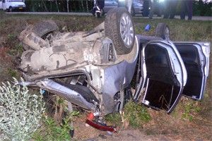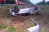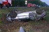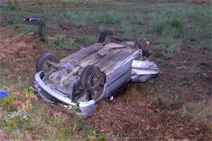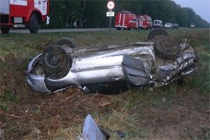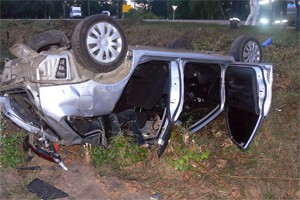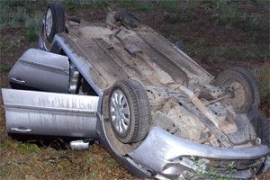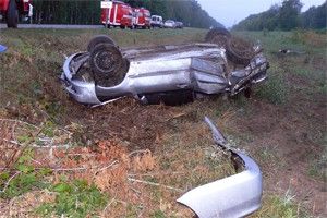 Водитель Mitsubishi Lancer значительно превышая скорость, на выезде из города выехал за пределы проезжей части. Автомобиль опрокинулся.