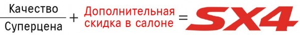 Suzuki усовершенствует формулу рациональных решений! С февраля 2013 г. в автосалонах официальной дилерской сети Suzuki открыто новое рациональное предложение на Suzuki SX4! Формула проста как все гениальное: возьмите высокое качество, поделите на суперцену и добавьте к полученному дополнительную скидку в салоне. За знаком равенства будет стоять спортивный кроссовер SX4! .