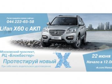 Приглашаем Вас стать участниками тест-драйва автомобилей Lifan Х60 с автоматической и механической трансмиссией. Тест-драйв состоится 22 июня 2013 года по адресу Московский проспект, 34-В, (парковка РЦ «Блокбастер»). Начало тест-драйва – 12.00.