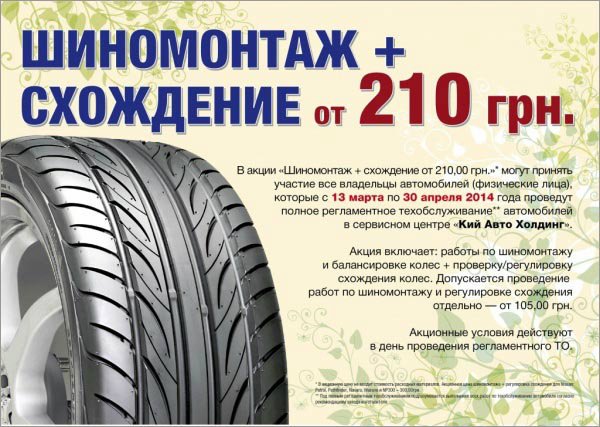 В акции «Шиномонтаж + схождение от 210,00грн.» * могут принять участие все владельцы автомобилей (физические лица), которые c 13 марта по 30 апреля 2014 года проведут полное регламентное техобслуживание** автомобилей в сервисном центре «Кий Авто Холдинг».