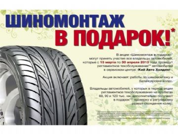 В акции «Шиномонтаж в подарок»* могут принять участие все владельцы автомобилей, которые c 15 марта по 30 апреля 2013 года проведут регламентное техобслуживание** автомобилей в сервисном центре «Кий Авто Холдинг».
