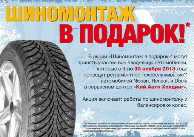 В акции «Шиномонтаж в подарок»* могут принять участие все владельцы автомобилей, которые c 1 по 30 ноября 2013 года проведут регламентное техобслуживание** автомобилей Nissan в сервисном центре «Кий Авто Холдинг».