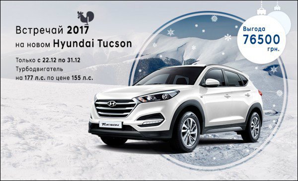 Новогодние праздники уже близко, и мы готовы дарить подарки! С 22.12 и до 31.12 Вы можете купить мощный Hyundai Tucson с бензиновым турбодвигателем 1.6 T-GDi с экономией до 76 500 гривен! Поспешите – срок действия акции ограничен!