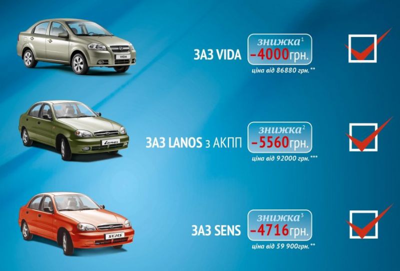 ЗАЗ VIDA является потомком знаменитого Chevrolet Aveo. ЗАЗ VIDA - это сочетание корейского качества, надежности и украинской цены! Благодаря прочной конструкции кузова, эргономичной подвеске, богатой комплектации, наличию модели с АКПП и 2-х видов кузовов - седан и хэтчбек, а также уникальному соотношению «цена-качество» ЗАЗ VIDA можно смело назвать лучшим в своем классе автомобилем.