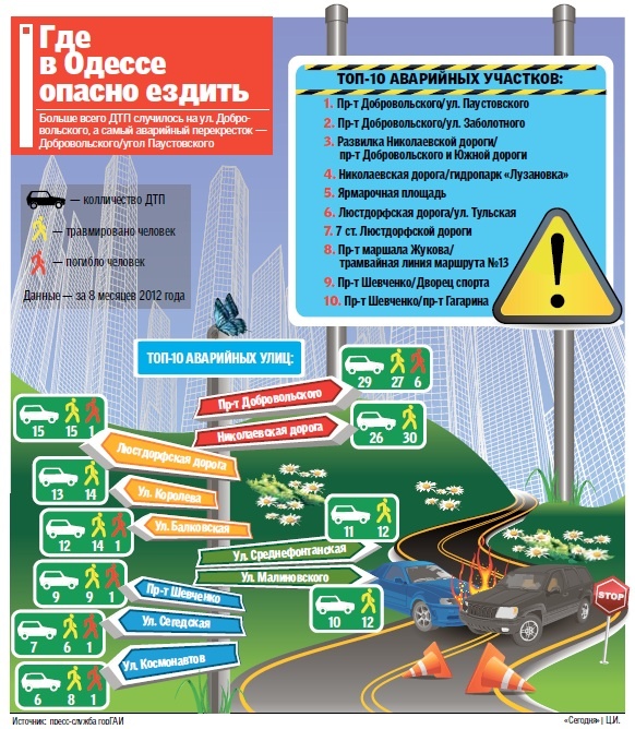 С начала 2012 года в Одессе произошло 739 ДТП, при этом погибли 38 человек, а 867 получили увечья. Печальную статистику пояснили в пресс-службе горГАИ: большинство аварий произошло из-за элементарного несоблюдения ПДД — превышения скорости и игнорирования предупредительных знаков, сообщает .
